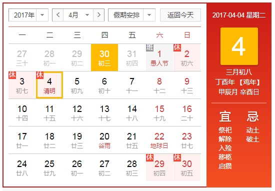 一、放假時間安排:2017年4月2日(星期日)至2017年4月4日(星期二)放假,共3天,4月5日(星期三)正常上班